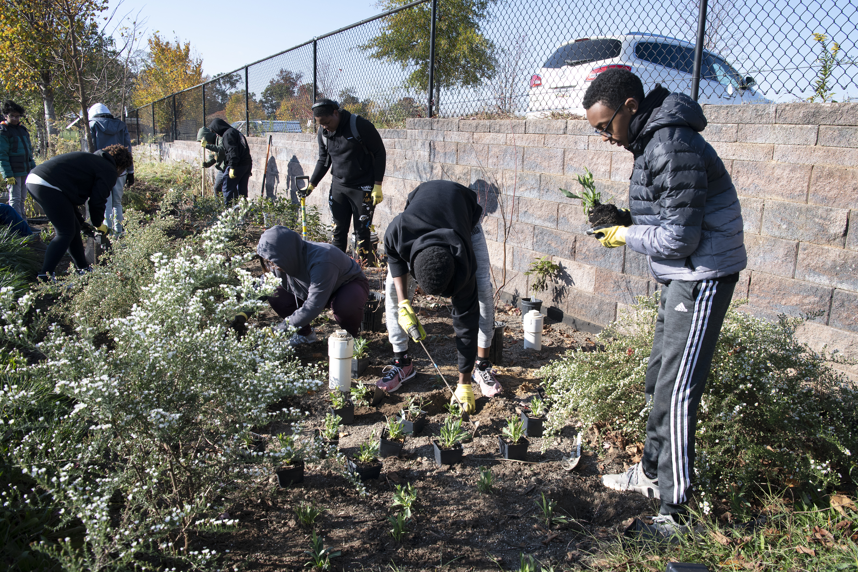 Montgomery County Public Schools (MCPS), in partnership with the Montgomery County Department of Environmental Protection (DEP) hosted a Student Environment Volunteer Day on Wednesday, Nov. 1, at Gaithersburg High School. Students learned about sustainability and helped beautify the community. They also worked to enhance the health of the environment by planting native plants and trees in the stormwater management gardens around the school.